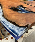 Epoxidharz Tisch aus Nussbaum mit ozeanblauem Harz und weissem Wellenverlauf