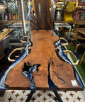 Das warme, charakterstarke Nussbaumholz verleiht dem Tisch Tiefe und Eleganz. Die natürlich gewachsene Form der Kante bleibt erhalten und wird durch das Epoxidharz perfekt ergänzt. Die weissen Akzente wirken wie sanfte Schaumkronen, die sich durch das blaue Harz ziehen und dem Tisch eine fast maritime Leichtigkeit geben.