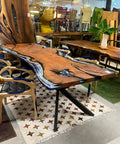 Getragen wird die Platte von einem stabilen schwarzen Untergestell, das die organische Form optimal zur Geltung bringt und für sicheren Stand sorgt. Ob als stilvoller Esstisch, exklusives Designobjekt oder Ort für gesellige Runden, dieser Tisch ist mehr als nur ein Möbelstück. Er ist ein echtes Erlebnis für alle Sinne.